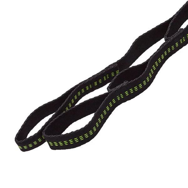 Das lange Ende wird um den Träger (z. B. einen Baumstamm) gelegt, das freie Ende mit der Hängematte verbunden. 15 Schlaufen ermöglichen eine präzise Einstellung.