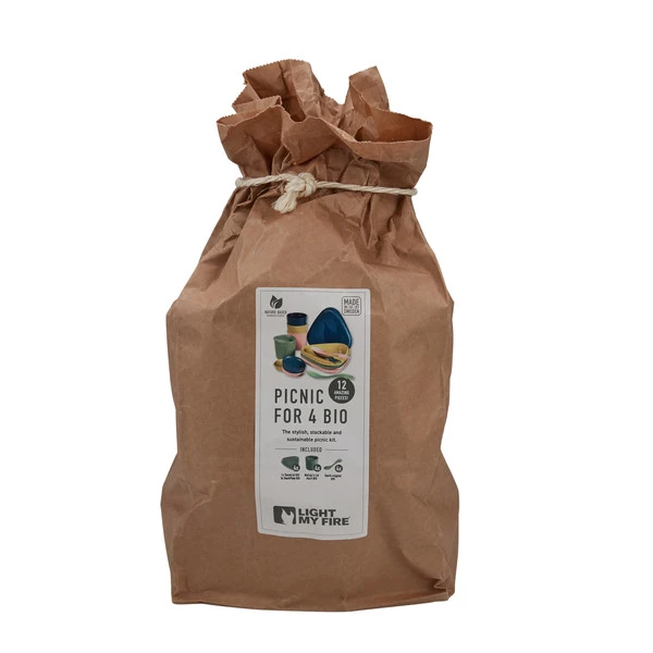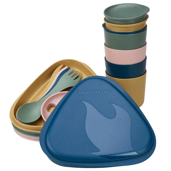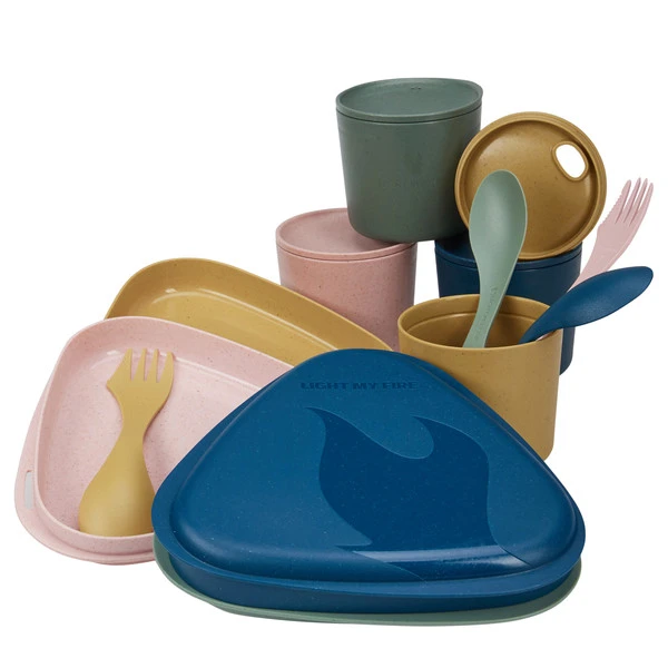 Das Picnic for 4 besteht aus vier Bechern mit Deckel, vier fest zusammensteckbaren Tellern und vier Sporks. Das Set ist platzsparend verstaubar (Becher und Teller stapelbar).