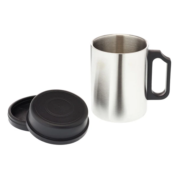 Gebürsteter Korpus aus doppelwandigem Edelstahl. Mit festschließendem Kunststoffdeckel (nicht auslaufsicher) und Kunststoffgriff, das nutzbare Volumen beträgt 0,35 L. Abnehmbarer Anti-Rutsch-Fuß.