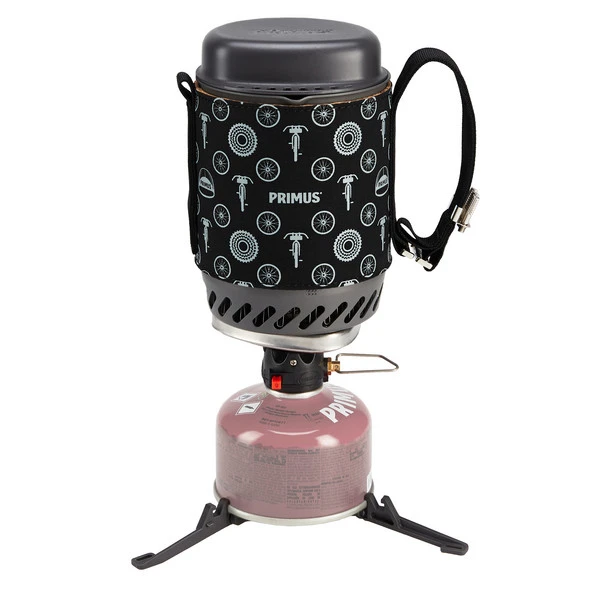 Kleines Kochsystem bestehend aus Topf mit integriertem Wärmetauscher und Deckel, abnehmbarer Topfummantelung mit Korkisolierung, Gasbrenner, Kartuschenstandfuß, Topfauflagen, Handtuch und Aufhänger.