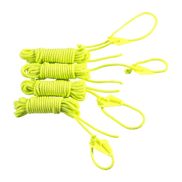 Geflochtene Zeltleine aus dehnungsarmem Polypropylen mit Dreilochspanner, fertig geknotet. 4 Stück mit Abspanner (je 4 m lang).