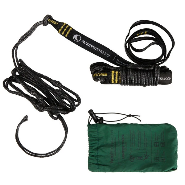 Dieses Set aus Polyesterbändern und HMPE-Seilen lässt sich ideal mit der leichtesten Ticket to the Moon-Hängematte „Lightest Hammock“ kombinieren.